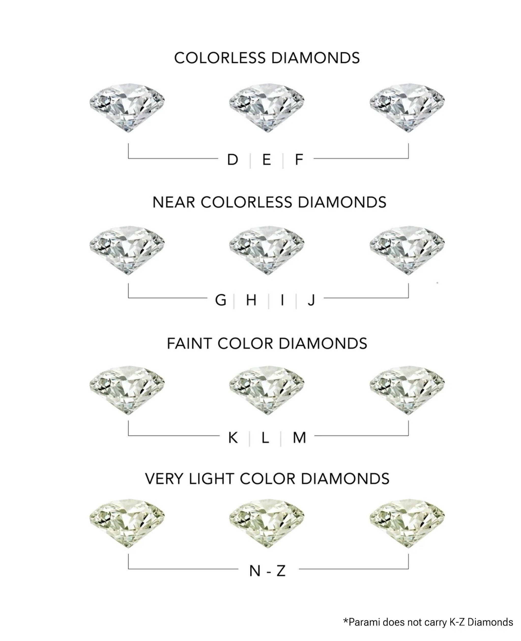G, H, I, and J are near colorless grades. They can feature a warmth but mostly look colorless face-up and nearly colorless face-down. When mounted in a yellow or rose gold setting, they may appear to have slight traces of color that are generally not noticeable without a professional eye.