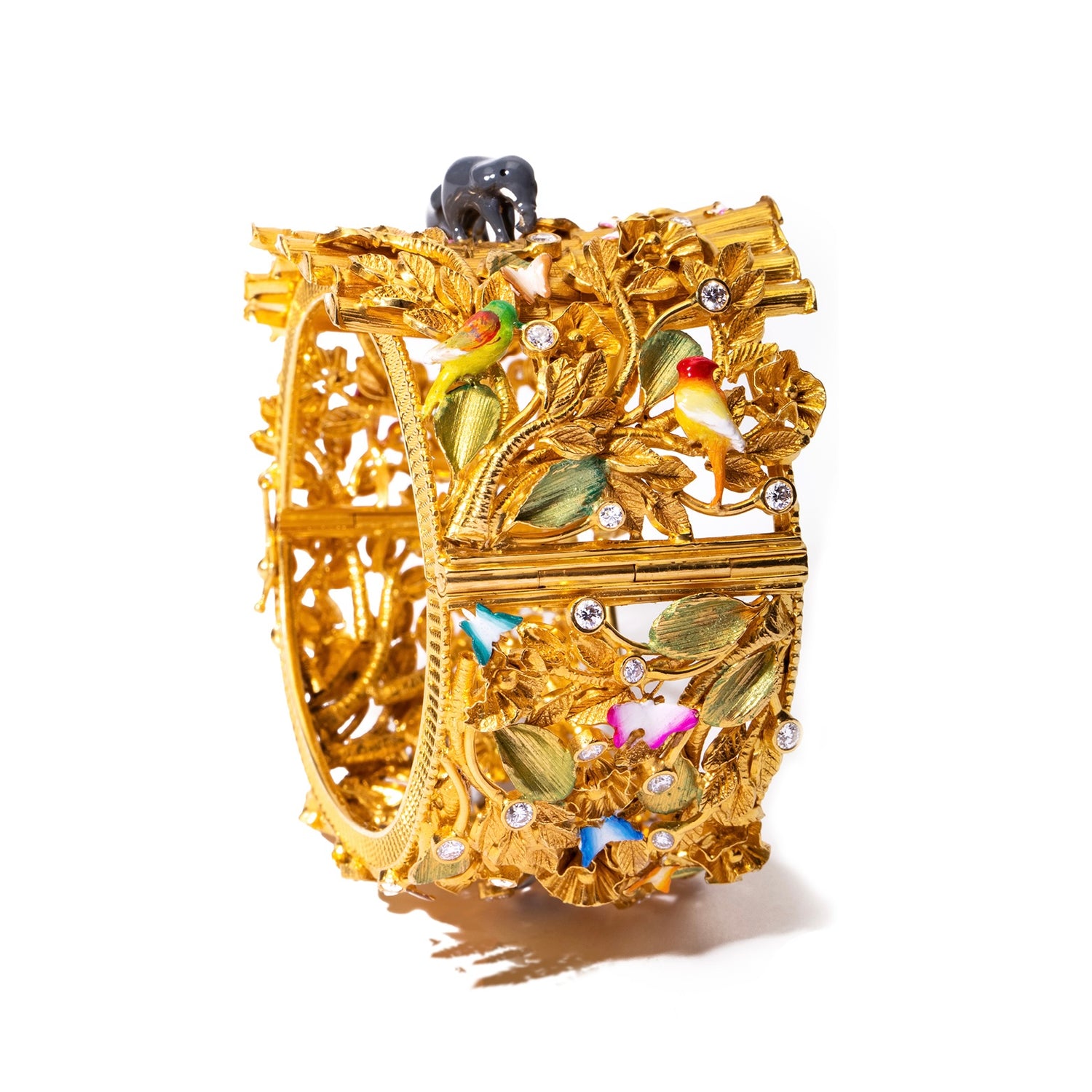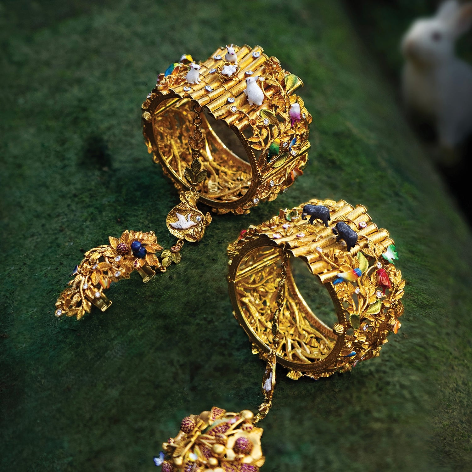 A stylised expression of elephants walking on Diamond dew drops, this bangle is another enchanting piece from the house, reflecting the hues of a fresh morning in a jungle, in the form of exquisite jewellery.