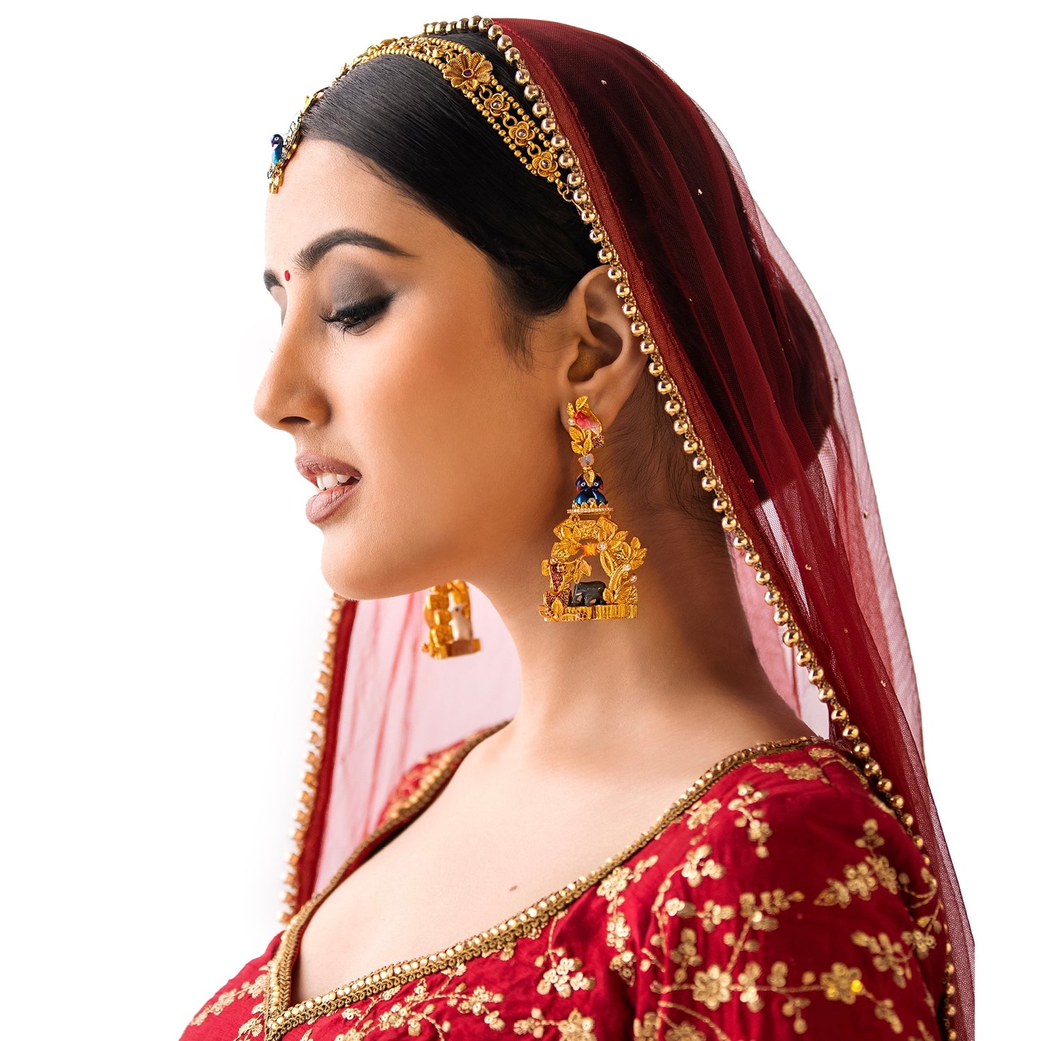 Rendering a narrative of a carefree elephant playing in his own little world, a vista no less than realising heaven's bliss, this Tusker's Heaven Earring bedecked with Diamond and Rubies, enhances the allure of the wearer.