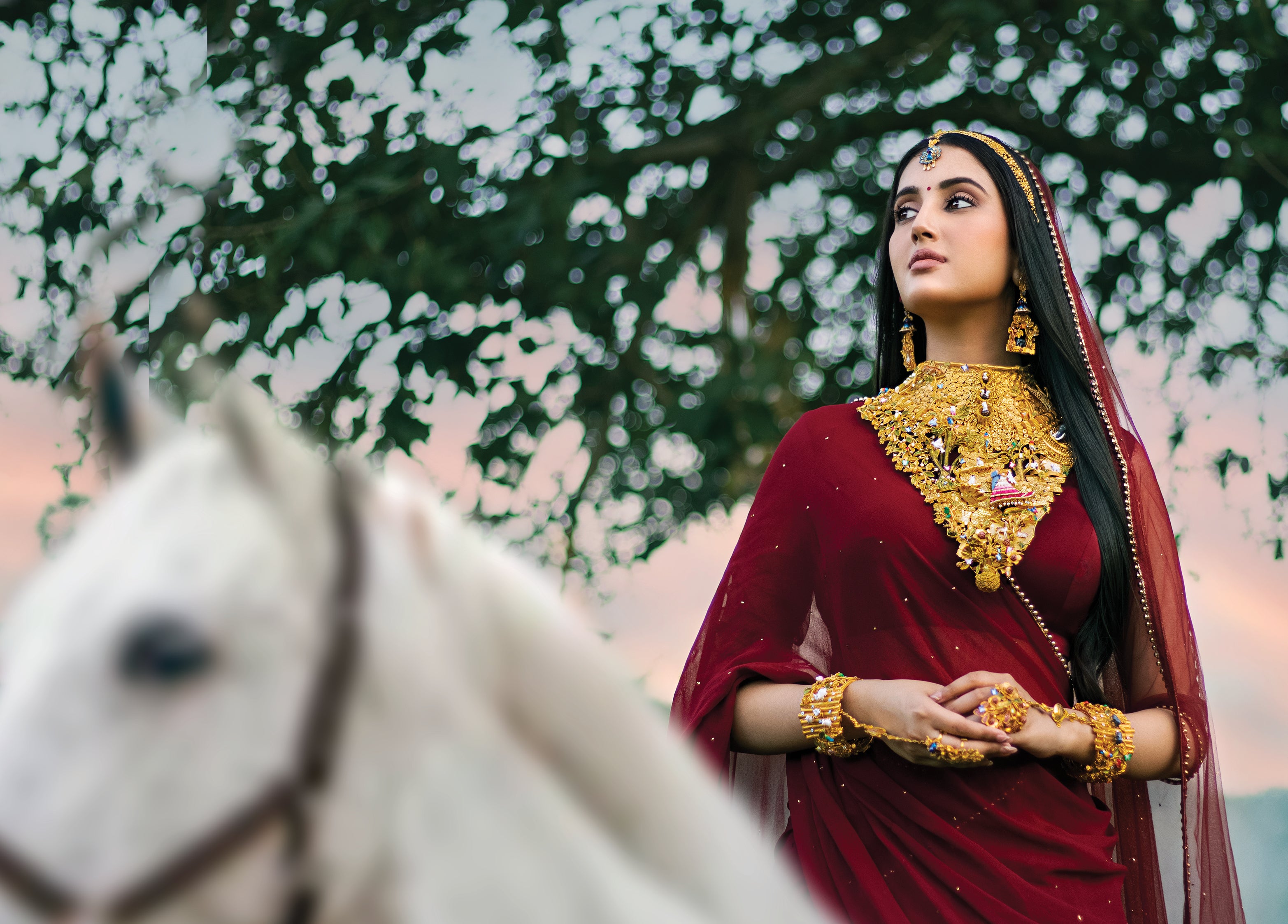 Executed using the Maison's repertoire of techniques, this elegantly hypnotic necklace portraying the purest form of Love and Nature's benevolence is a testament to the Atelier's prowess of excellent artistry. The flawless & colourless Nature's Purest Diamonds with Brilliant Heart & Arrow Cut, that celebrate love; with finest of African Rubies, perfectly create a picturesque world of wedding. More than Four Thousand pieces of Hnd Crafted Gold are joined to bring life to a beautiful imagination, and is further enhanced by superior enamel art. The exclusive South Sea Pearls are carefully sourced gracing her neck.