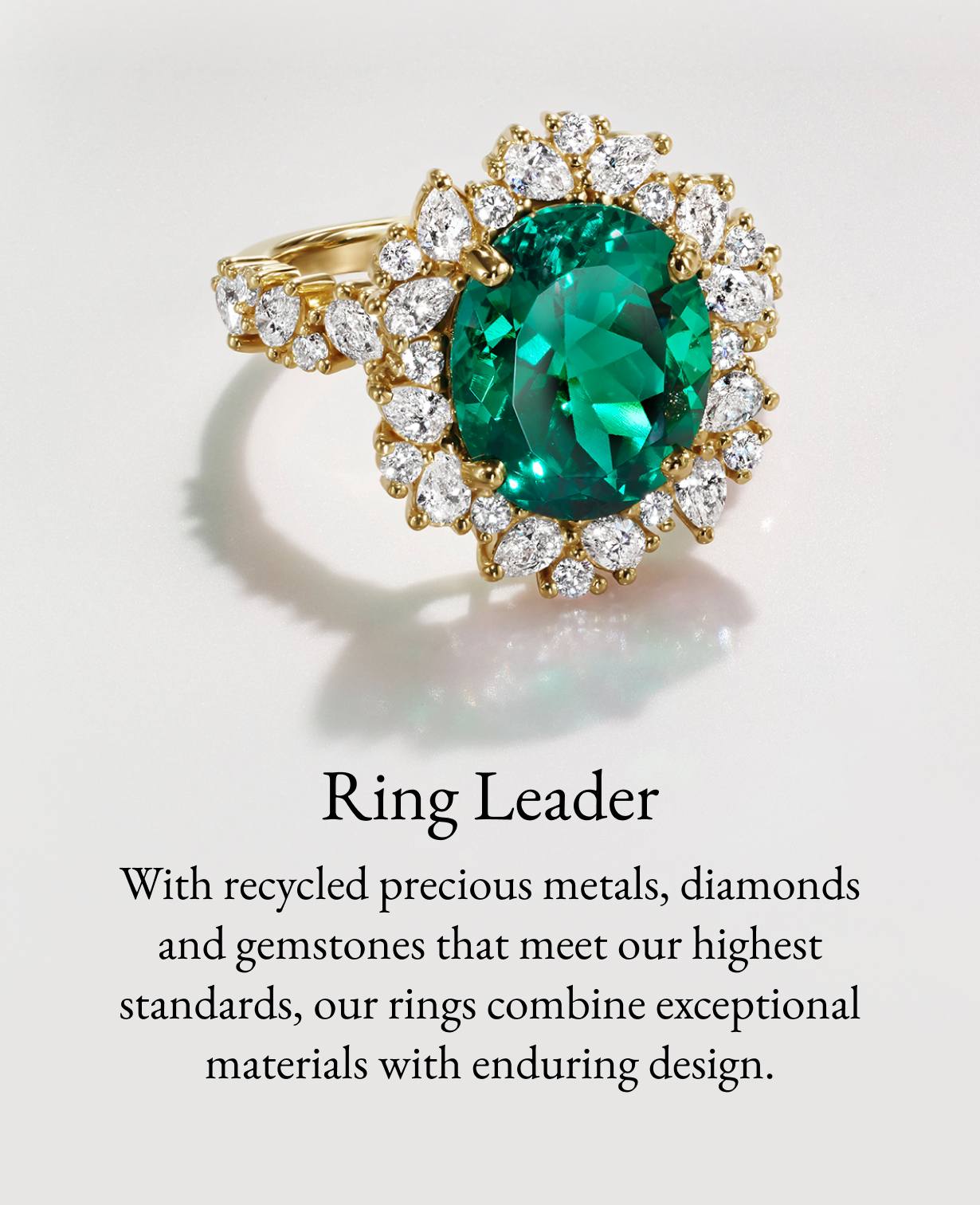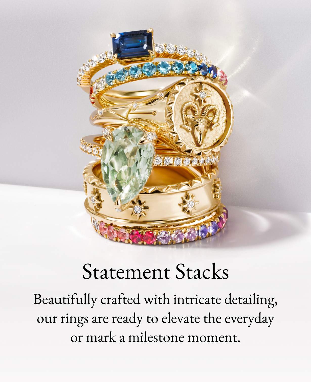 Design a love stack with gold fashion rings, ethically sourced gemstone rings, or start at the center with a customizable diamond engagement ring.